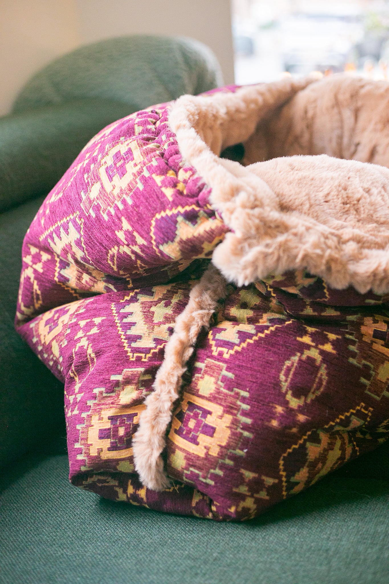 Burgundy kilim - velvet / faux fur snuggle sack
